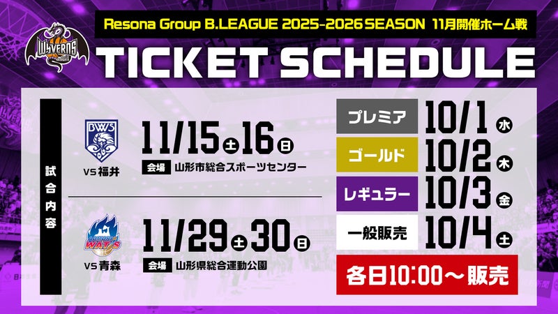 山形ワイヴァンズでは、2025年10月1日(水)10:00よりファンクラブ先行で、Resona Group B.LEAGUE 2025-26SEASON 2025年11月開催試合の前売券の販売を開始いたします。
