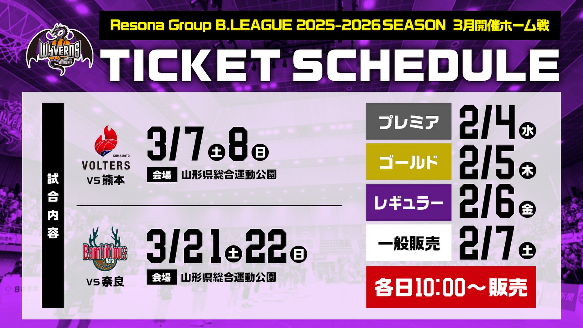 山形ワイヴァンズでは、2026年2月4日(水)10:00よりファンクラブ先行で、Resona Group B.LEAGUE 2025-26SEASON 2026年3月開催試合の前売券の販売を開始いたします。