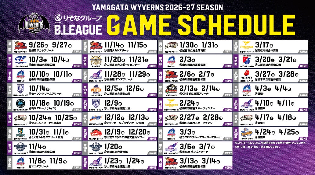 日頃より、山形ワイヴァンズへたくさんのご声援をいただき、誠にありがとうございます。 この度、下記試合の試合日程が変更することとなりましたのでお知らせいたします。 対象試合 りそなグループ B.LEAGUE 2026-27 SEASON 第9節(AWAY) 青森ワッツ 戦 日程 GAME1 2026年11月8日(日) GAME2 2026年11月9日(月) 会場 マエダアリーナ(新青森県総合運動公園)
