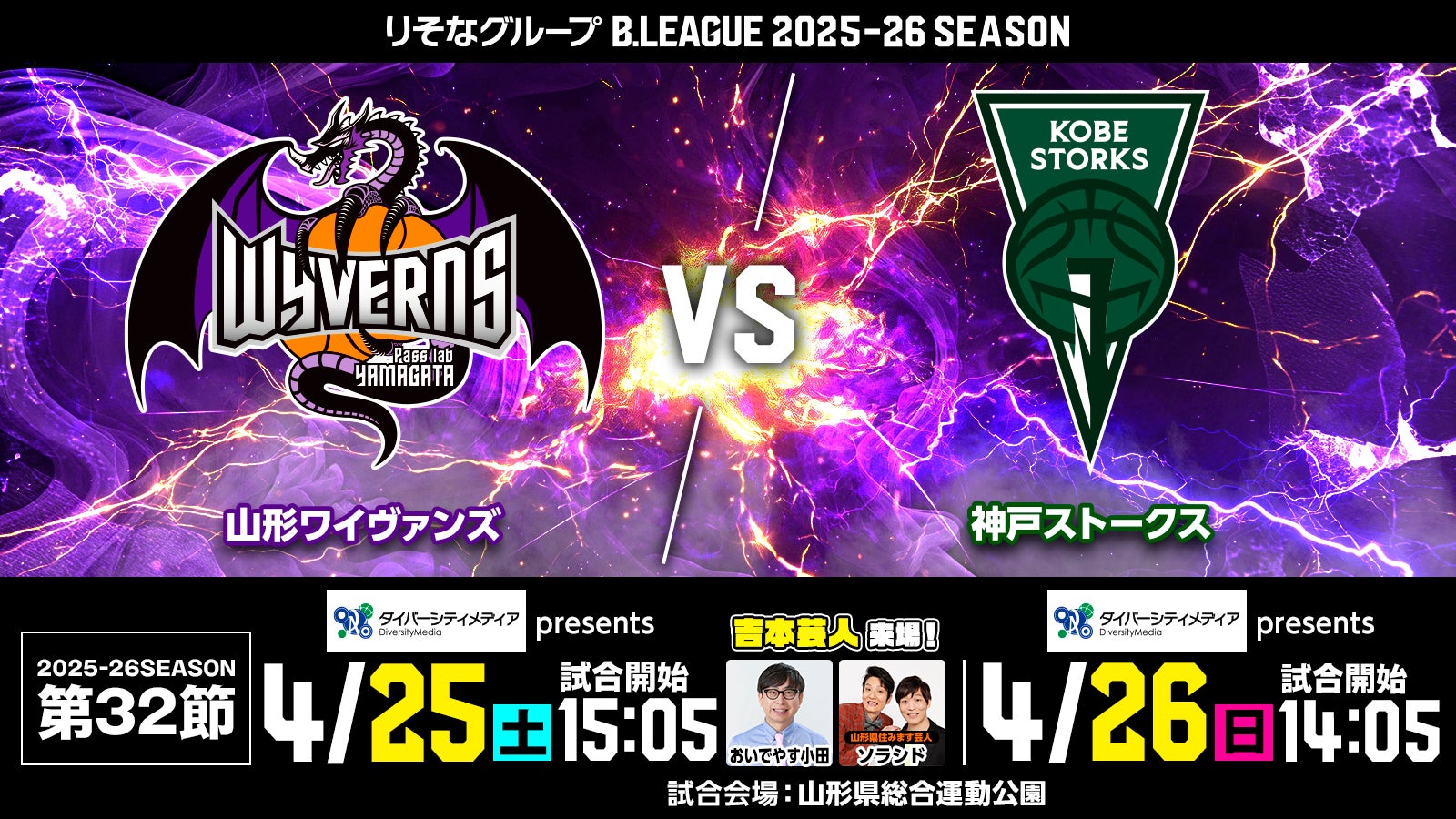 NEW OTHER EVENT 2026.03.12 【4月26日(日)神戸戦】よしもと芸人が特別ゲストで来場決定! 日頃より、山形ワイヴァンズへたくさんの応援をいただき、誠にありがとうございます。 4月26日(日)のホームゲームに、よしもと芸人さんが特別ゲストでご来場します! オープニングやハーフタイムに会場を盛り上げていただきます! ぜひご来場いただき、よしもと芸人さんと共に勝利を分かち合いましょう! 対象試合 ■第32節 VS 神戸ストークス GAME2 4月26日(日)14:05 TIP OFF 会場:山形県総合運動公園 ■おいでやす小田さん ■ソラシド 本坊元児さん・水口靖一郎さん【山形県住みます芸人】 皆さまのご来場お待ちしてます! 試合情報