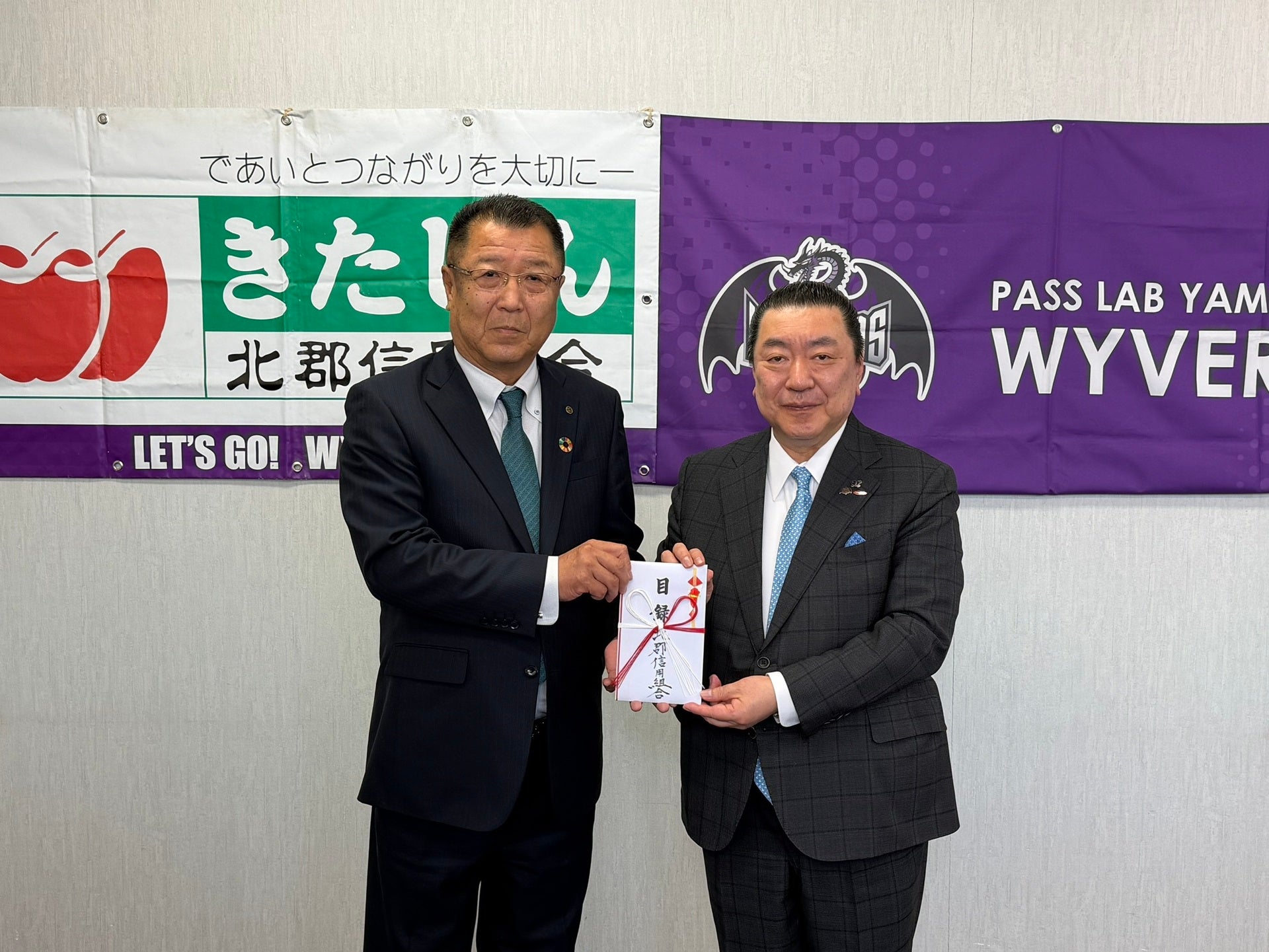 4月6日(月)、北郡信用組合様より、「山形ワイヴァンズ応援カードローン」の支援金をご贈呈いただきました。